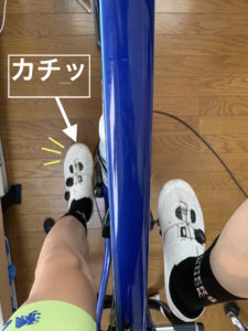 まずは利き脚側のクリートをペダルにはめます。