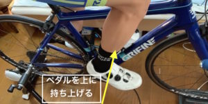 既にクリートを固定した利き脚側でペダルを上から踏み込み、走り出します。その際、持ち上がってきた反対のペダルを逆脚のクリートでキャッチします。