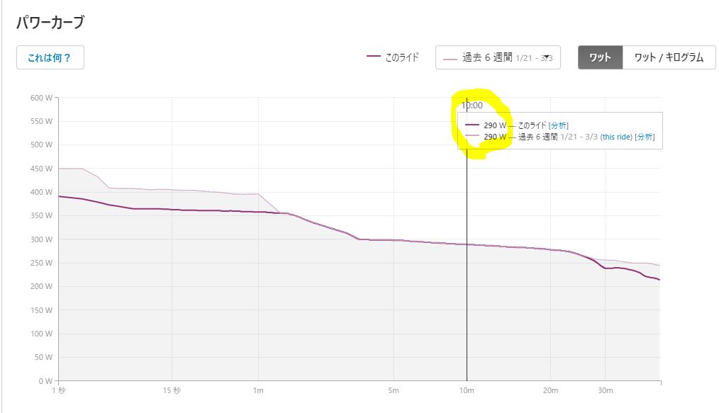 L5領域の高強度を混ぜたおかげで10分パワーが伸びて290Wまで到達しました。